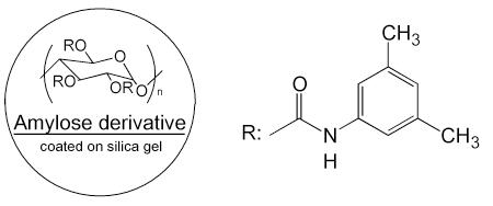 纖維素型是使用最廣泛的手性柱之一,纖維素型手性色譜柱的分離作用包括相互吸引的作用及形成包埋復(fù)合物。它們屬于Wainer分類中的第2種類型。市售的手性色譜柱為微晶三醋酸基、三安息香酸基、三苯基氨基酸鹽纖維素固定相。很多化合物可通過此類型的色譜柱得到分離。這種類型的手性色譜柱種類也很齊全。流動(dòng)相使用低極性溶劑,典型的流動(dòng)相為異丙醇-正己烷混合物。這類柱子根據(jù)制作工藝,分為涂敷與鍵合兩大類。但特別要注意由于氯可以使涂敷纖維素從硅膠上脫落,因此要確保涂敷類柱子流動(dòng)相中無含氯溶劑。