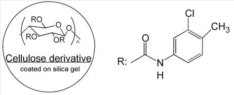 纖維素型是使用最廣泛的手性柱之一,纖維素型手性色譜柱的分離作用包括相互吸引的作用及形成包埋復(fù)合物。它們屬于Wainer分類中的第2種類型。市售的手性色譜柱為微晶三醋酸基、三安息香酸基、三苯基氨基酸鹽纖維素固定相。很多化合物可通過此類型的色譜柱得到分離。這種類型的手性色譜柱種類也很齊全。流動相使用低極性溶劑,典型的流動相為異丙醇-正己烷混合物。這類柱子根據(jù)制作工藝,分為涂敷與鍵合兩大類。但特別要注意由于氯可以使涂敷纖維素從硅膠上脫落,因此要確保涂敷類柱子流動相中無含氯溶劑。