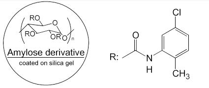 纖維素型是使用最廣泛的手性柱之一,纖維素型手性色譜柱的分離作用包括相互吸引的作用及形成包埋復(fù)合物。它們屬于Wainer分類中的第2種類型。市售的手性色譜柱為微晶三醋酸基、三安息香酸基、三苯基氨基酸鹽纖維素固定相。很多化合物可通過此類型的色譜柱得到分離。這種類型的手性色譜柱種類也很齊全。流動相使用低極性溶劑,典型的流動相為異丙醇-正己烷混合物。這類柱子根據(jù)制作工藝,分為涂敷與鍵合兩大類。但特別要注意由于氯可以使涂敷纖維素從硅膠上脫落,因此要確保涂敷類柱子流動相中無含氯溶劑。