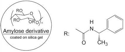 纖維素型是使用最廣泛的手性柱之一,纖維素型手性色譜柱的分離作用包括相互吸引的作用及形成包埋復合物。它們屬于Wainer分類中的第2種類型。市售的手性色譜柱為微晶三醋酸基、三安息香酸基、三苯基氨基酸鹽纖維素固定相。很多化合物可通過此類型的色譜柱得到分離。這種類型的手性色譜柱種類也很齊全。流動相使用低極性溶劑,典型的流動相為異丙醇-正己烷混合物。這類柱子根據(jù)制作工藝,分為涂敷與鍵合兩大類。但特別要注意由于氯可以使涂敷纖維素從硅膠上脫落,因此要確保涂敷類柱子流動相中無含氯溶劑。
