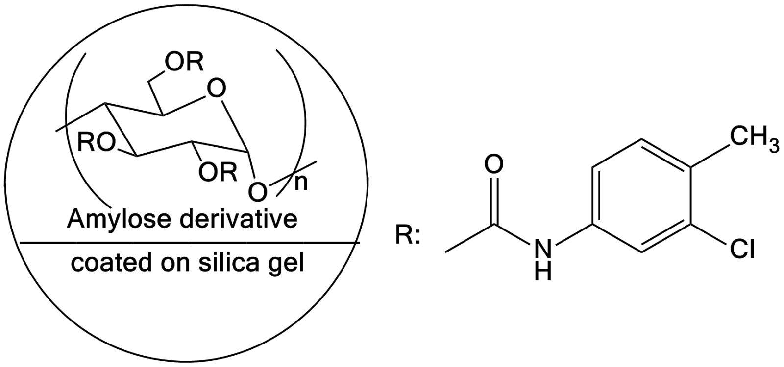 纖維素型是使用最廣泛的手性柱之一,纖維素型手性色譜柱的分離作用包括相互吸引的作用及形成包埋復(fù)合物。它們屬于Wainer分類中的第2種類型。市售的手性色譜柱為微晶三醋酸基、三安息香酸基、三苯基氨基酸鹽纖維素固定相。很多化合物可通過此類型的色譜柱得到分離。這種類型的手性色譜柱種類也很齊全。流動(dòng)相使用低極性溶劑,典型的流動(dòng)相為異丙醇-正己烷混合物。這類柱子根據(jù)制作工藝,分為涂敷與鍵合兩大類。但特別要注意由于氯可以使涂敷纖維素從硅膠上脫落,因此要確保涂敷類柱子流動(dòng)相中無含氯溶劑。